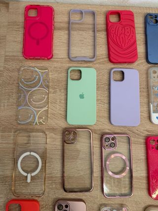 Lote de fundas para iPhone 13. Fundas IPhone 13: 3€ Fundas IPhone Bimba&Lola: 10€ - Funda rosa con MagSafe. - Funda transparente con sonrisas. - Funda verde menta. - Funda morada. - Funda transparente con corazones. - Funda con estampado de leopardo. - Funda azul. - Funda roja con logo. - Funda rosa con cámara. - Funda transparente con flores. - Funda con diseño de carita sonriente. - Funda morada con purpurina. - Funda negra con correa. - Funda azul marino. - Funda arcoíris. - Funda transparente con MagSafe. - Funda morada con MagSafe. - Funda verde brillante. - Funda rosa brillante.