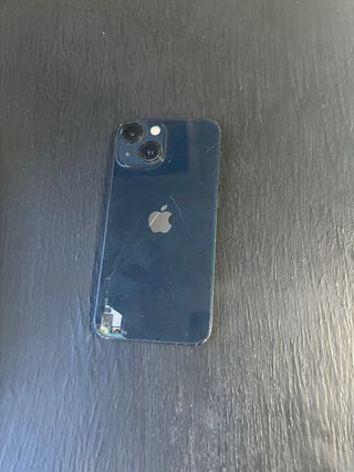 Teléfono móvil iPhone 13 mini en color azul marino. - Pantalla de 5.4 pulgadas. - Salud bateria 79%. - Cristal trasero roto. El movil funciona bien lo único a cambiar es la batería y el puerto de carga no funciona bien, yo lo cargaba con base de carga. El cristal trasero es mas por estética.
