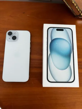 Teléfono móvil en color azul con 128GB de almacenamiento. - Capacidad de batería del 90%. - Modelo iPhone 15.