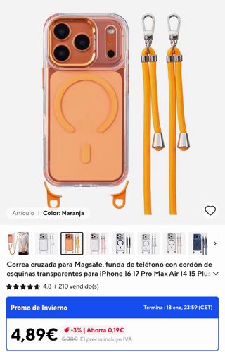 Vendo funda transparente con cordón para iPhone 14 Plus en color naranja sin estrenar. La vendo porque me equivoque de modelo de iphone y no me la cambian - Diseño con cordón cruzado. - Esquinas transparentes.