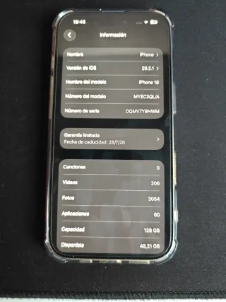 iPhone 16 en color azul con 128GB de almacenamiento. En perfevto estado con factura de compray caja original siempre usado con funda y protector de pantalla que lo tiene puesto. - Modelo: iPhone 16 - Capacidad: 128 GB - Color: Azul - Versión de iOS: 26.2.1 - Número de serie: DQMV7Y9HWM - Garantía limitada hasta 28/7/26 - Espacio disponible: 48,21 GB