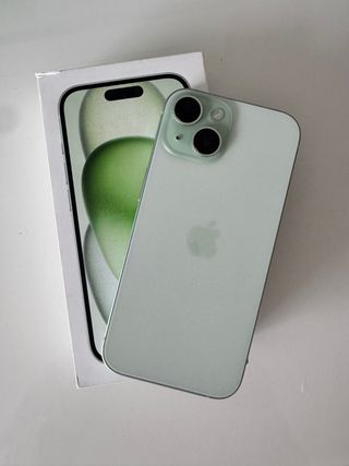 Teléfono móvil iPhone 15 en color verde y plata. - salud de bateria de un 89% -siempre estuvo con protector de pantalla y funda, nunca ha recibido ningun golpe. -con caja y cable de carga. - Diseño elegante y moderno. - Acabado metálico.
