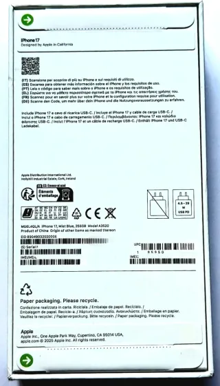 Teléfono móvil iPhone 17 en color azul. Comprado para un regalo que finalmente no se hizo. Sin usar. Factura del corte inglés del 13/02/26