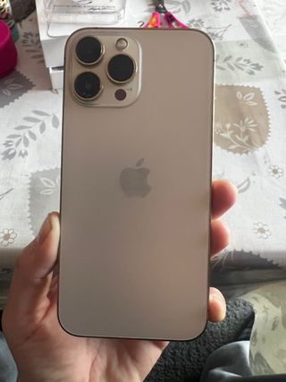 Teléfono móvil iPhone 13 Pro Max en color dorado y con 256GB de almacenamiento. - Pantalla Super Retina XDR. - Sistema de cámaras Pro avanzado. - Chip A15 Bionic. - Esta en perfecto estado, solo una minima rajita leve en la camara pero va perfexto. - Salud bateria 77% - Funciona todo perfecto. - Se compro nuevo en su dia y tengo caja y todo original.