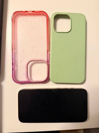 Se vende iPhone 13 Pro, con dos fundas una verde y otra rosa. Incluye: - Funda verde de silicona. - Funda rosa translúcida. - iPhone 13 Pro con 256GB de almacenamiento. -Cable de carga Funciona correctamente. Parte de atrás rota pero todo lo demás funciona totalmente Precio negociable. También cambio por nintendo switch