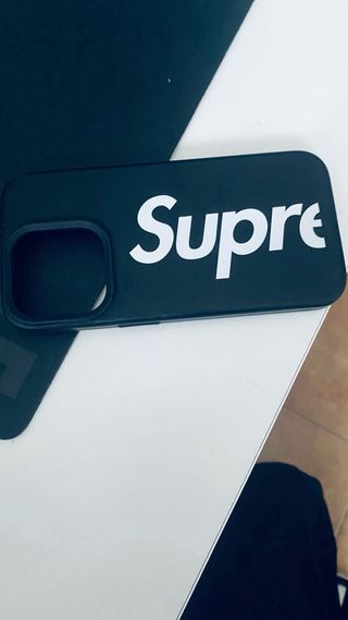 Funda negra para iPhone 15 con el logo de Supreme. - Diseño con logo blanco. - Material resistente.