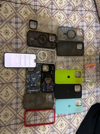 Lote de fundas para iPhone en diferentes colores y acabados. - Funda azul translúcida con purpurina. - Funda azul marino con diseño de líneas. - Funda blanca translúcida con purpurina. - Funda rosa brillante. - Funda azul claro mate.