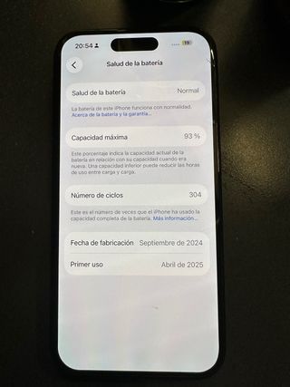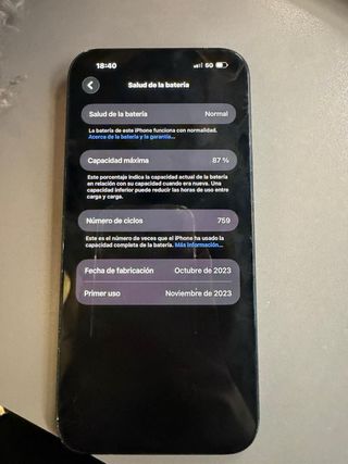 Teléfono móvil iPhone 15. Funciona perfectamente. Batería 83% de salud, sin problemas. Pantalla sin roces, es el protector de pantalla lo dañado. Si quieres más fotos las envío. Comprado en octubre de 2023, tiene garantía.