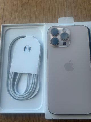 Teléfono móvil iPhone 16 Pro Max en color dorado. - Diseño elegante y moderno. - Acabado metálico premium. -Entrgo caja accesorios y factura del corte ingles -Estado de la bateria al 100% -No envio solo trato en mano por galicia