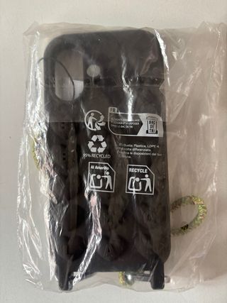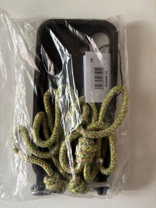 Funda para iPhone 16 con diseño moderno y cordón. - Color negro. - Cordón trenzado en tonos verde y rojo. - Incluye detalle metálico en el cordón.
