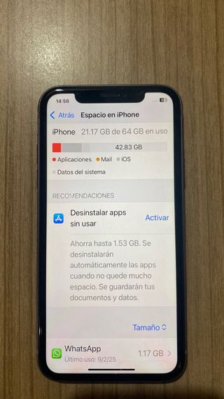 Teléfono móvil iPhone 11 en perfecto estado. - Capacidad de almacenamiento de 64 GB. - Memoria RAM de 4 GB.