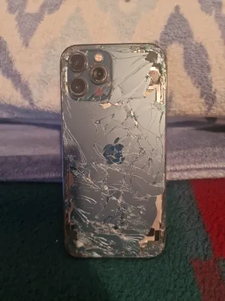 Teléfono iPhone 12 Pro Max con la pantalla y parte trasera dañadas. - Pantalla y trasera agrietadas. - Módulo de cámaras intacto.