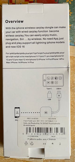 Adaptador para iPhone que permite la conexión inalámbrica a CarPlay. Su diseño es compacto y moderno. - Conexión USB. - Acabado en fibra de carbono.