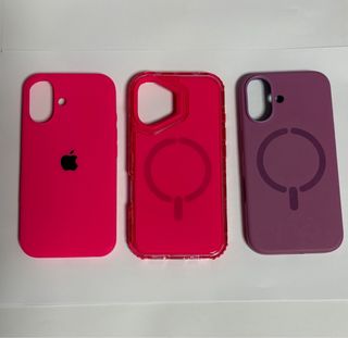 Conjunto de fundas para iPhone 16. - Funda color rosa fosforito de silicona con logo de apple. - Funda transparente rosa con anillo magnético. - Funda color morado de silicona con anillo magnético. SE VENDE CADA UNA A 5€, LAS TRES A LA VEZ POR 10€