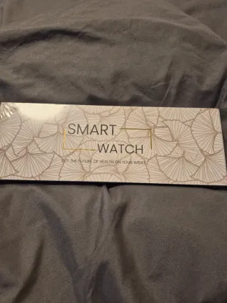 Elegante reloj inteligente con un diseño moderno. - Combinación de colores negro y dorado. - Diseño con motivos de hojas. - Eslogan: Pon el futuro de la salud en tu muñeca.