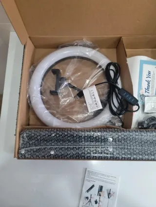 Aro de luz LED con trípode ajustable, ideal para fotografía y vídeo. - Aro de luz circular. - Trípode negro. - Control de intensidad y color.