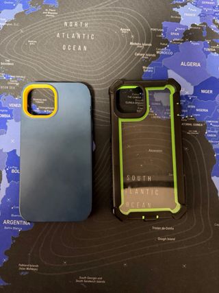Tres fundas para iPhone 13, a estrenar. - Funda de silicona color verde lima. - Funda transparente con diseño de freno de coche. - Funda con diseño mecánico industrial en tonos naranja y negro. Consultar precio