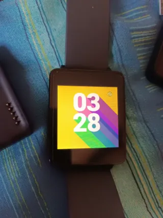 Se venden dos smartwatches LG G Watch en color negro. Uno de ellos está conectado a su cargador. - Diseño elegante y moderno. - Correa de cuero en un modelo y de silicona en el otro. - Caja original EL PRECIO ES DE LOS DOS JUNTOS