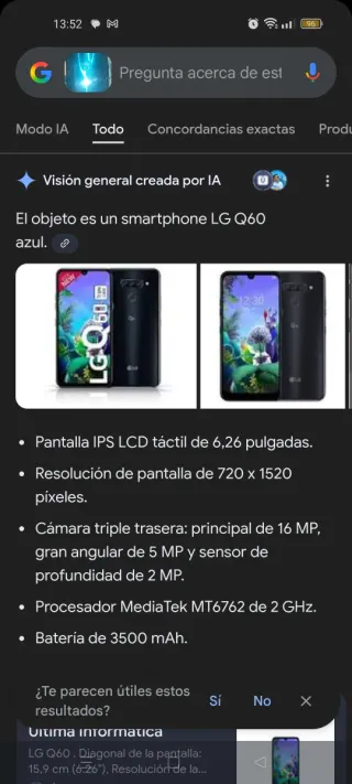 Teléfono móvil LG Q60 en color azul. Caja original. Diagonal de la pantalla: 15,9 cm (6.26"), Resolución de la pantalla: 1520 x 720 Pixeles, Tipo de visualizador: IPS. Frecuencia del procesador: 2 GHz, Familia de procesador: MediaTek, Modelo del procesador: MT6762. Capacidad de RAM: 3 GB, Capacidad de almacenamiento interno: 64 GB. Resolución de la cámara trasera (numérica): 16 MP, Tipo de cámara trasera: Triple cámara. Capacidad de la tarjeta SIM: SIM doble. Sistema operativo instalado: Android 9.0. Capacidad de batería: 3500 mAh. Color del producto: Azul. Peso: 172 g. No rebajo el precio.