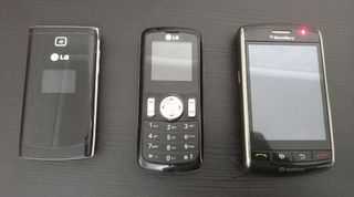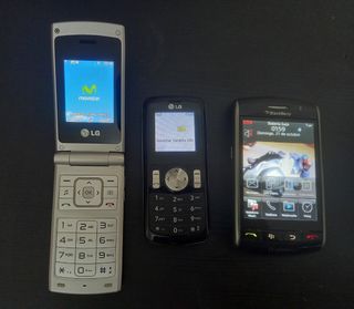 Conjunto de tres teléfonos móviles antiguos, perfectos para coleccionistas o para quienes buscan un estilo retro. - Un teléfono móvil tipo concha plateado de la marca LG. - Un teléfono móvil tipo barra negro de la marca LG. - Un teléfono móvil tipo barra negro de la marca BlackBerry, para cambio de batería dura muy poco y revisar táctil limpiar.