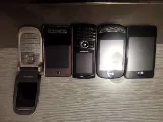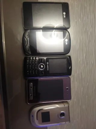 Conjunto de cinco teléfonos móviles de diferentes marcas y modelos. - Dos teléfonos LG. - Un teléfono Vodafone. - Un teléfono Samsung. - Un teléfono con tapa.