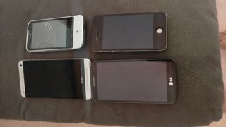 Se venden cuatro teléfonos móviles usados, ideales para reparar o usar piezas. Los teléfonos son de las marcas Apple, HTC y LG. Algunos presentan señales de uso como arañazos. - Incluyen un iPhone, dos HTC y un LG. - Algunos tienen pantallas dañadas.