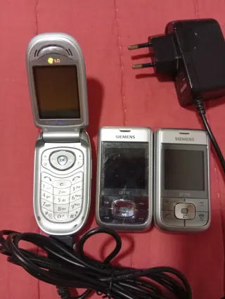 Se venden seis teléfonos móviles antiguos de diferentes marcas. Están en buen estado, aunque algunos presentan señales de uso. - Incluyen dos cargadores. - Marcas: LG, Nokia, Samsung y Siemens. - Modelos variados.