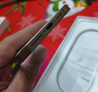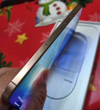 Teléfono móvil iPhone 16 Pro Max en color dorado. Tiene una capacidad de 256 GB. En la pantalla tiene una leve fractura pero el dispositivo funciona correctamente. - Salud batería: 100% - Diseño elegante y moderno. - Puerto de carga USB-C. - Altavoces estéreo.