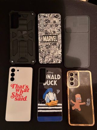 Pack de seis fundas para Samsung S21 con diferentes diseños. - Funda negra resistente con soporte. - Funda con diseño de cómic Marvel. - Funda negra con tapa protectora para cámara. - Funda blanca con texto That's what She said. - Funda con diseño de Donald Duck. (Tiene pequeña rotura en esquina superiod se adjunta foto) - Funda con diseño de Bart Simpson. La funda de barta simpson se regala con todo ya que esta bastante desgastada.