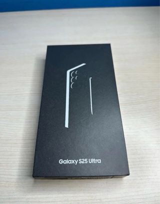 Caja para el Samsung Galaxy S25 Ultra. - Diseño elegante en color negro. - Ilustración frontal del dispositivo y S Pen.