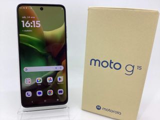 Teléfono móvil Motorola Moto G15 con acabado en color verde y 128GB de almacenamiento. Teléfono nuevo, comprado en noviembre de 2025, con 3 años de garantía. Lo vendemos porque no lo usamos.