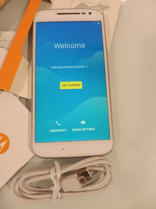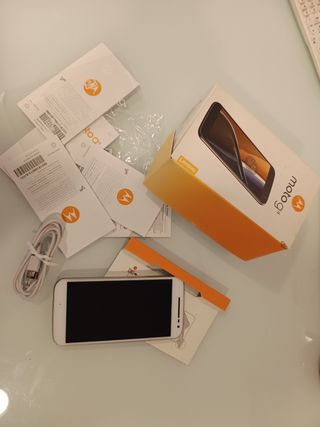 Teléfono móvil Motorola en color blanco, listo para usar. Se entrega con su caja original y cable USB. - Incluye caja original. - Cable USB para carga y datos.