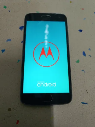 Teléfono móvil Motorola G5. - Pantalla con logo de Motorola y Android. - Botón de inicio en la parte frontal.