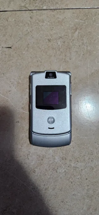 Teléfono móvil Motorola RAZR V3 en color plateado. Ideal para piezas o coleccionistas. - Diseño plegable. - Pantalla externa. - Cámara VGA.