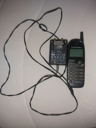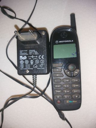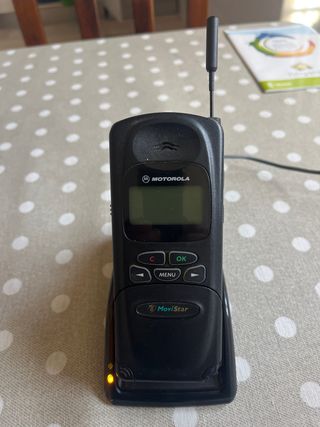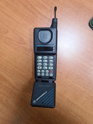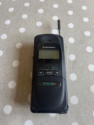 Teléfono móvil clásico de 1995. Un diseño icónico de la época. - Antena extensible. - Teclado numérico completo. - Pantalla LCD. - Logo de Motorola en la tapa.