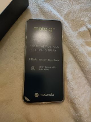 Teléfono móvil Motorola moto g14 con pantalla Full HD+. Nuevo en su caja, está abierta pero está sin estrenar. - Pantalla Full HD+. - Sonido Inmersivo Stereo. - Cámara de 50MP con Visión Nocturna.