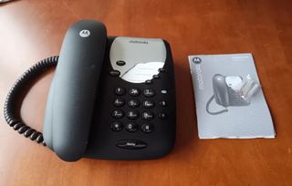 Teléfono Motorola pegado a la pared nuevo con sus cables.