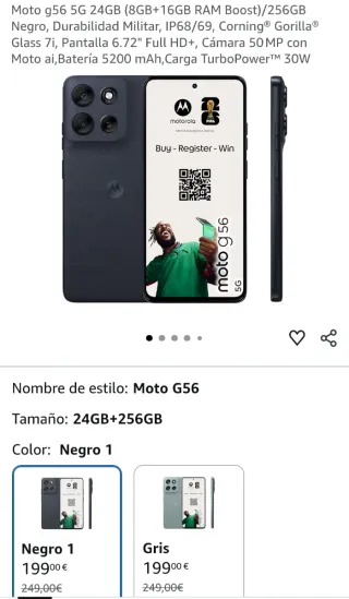 El precio mostrado es el de venta en nuestra tienda. El precio de este producto en nuestra página web puede ser diferente. Este artículo está disponible en nuestra tienda de Vitoria-Gasteiz. motorola g56 8gb 256gb CC055_E729309_0 es un objeto que se ofrece en estado excelente. Todos nuestros productos cuentan con garantía de 3 años y un plazo de devolución de 14 días. Marca: Motorola | Modelo: G56 8gb 256gb | Pulgadas: 6.72 | Capacidad: 256 | Operador: Libre | Megapixels: 50 | Memoria ram: 8 | 3g: 5g | Sistema operativo: Android | Caja original: Si | Informacion adicional: Revisar imágenes para accesorios incluidos. | Numero