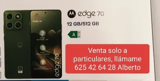 Teléfono móvil Motorola Edge 70 en color verde, completamente nuevo y sin usar. Cuenta con una gran capacidad de almacenamiento. - Pantalla con tecnología moto ai. - Batería de larga duración XXHR. - Cámara triple de 50MP. - Resistencia IP68/69 y certificación MIL STD. - Venta solo a particulares. Contactar con Alberto al 625 42 64 28.