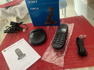 Teléfono inalámbrico Motorola en color negro. - Base de carga incluida. - Cargador de pared. - Adaptador de enchufe. - Prácticamente nuevo.