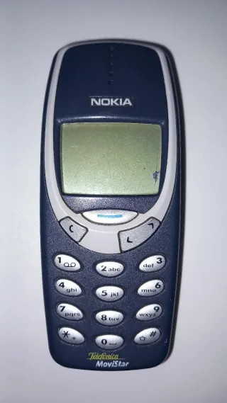 Teléfono móvil clásico Nokia 3310 en color azul, sin batería. - Diseño icónico y resistente. - Teclado numérico completo. - Pantalla monocromática. - Operador Movistar. - El 3310 original lanzado en el año 2000 (modelo NHM-5NX) no tiene ranura MicroSD, ni cámara, ni conectividad Bluetooth. #S