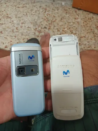 Dos teléfonos móviles, uno Nokia y otro Samsung, ambos con el logo de Movistar. - El Nokia es de color azul claro. - El Samsung es de color blanco y se encuentra abierto. Se venden los 5
