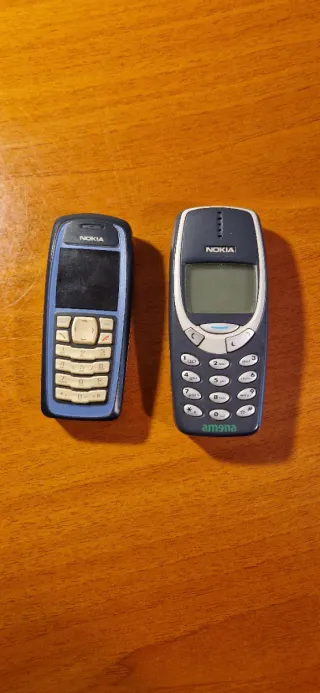 Dos teléfonos móviles Nokia clásicos, el modelo 3310 y el 3100. Ambos en color azul. El 3310 no tiene bateria