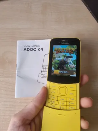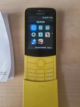 Teléfono móvil Nokia 8110 con diseño curvo y pantalla. - Conectividad WiFi y Bluetooth. - Incluye juegos, como el clásico Snake. - Color amarillo vibrante. - Antirrobo - Dual SIM - KAIOS Cargador por micro usb, carga perfectamente, se ve en las fotos.