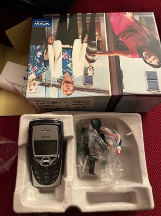 Teléfono móvil Nokia 8310 en su caja original, junto con un accesorio de moto. - Modelo Nokia 8310. - Incluye caja original. - Accesorio de moto. - Color negro y plateado.