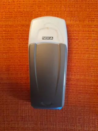 Teléfono móvil Nokia con diseño retro y teclado QWERTY completo. Ideal para coleccionistas o amantes de lo vintage. - Color plateado con detalles naranjas. - Incluye cargador.