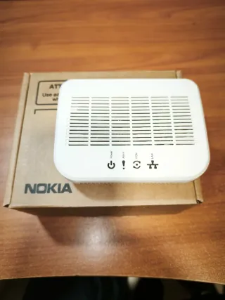 Dispositivo ONT de la marca Nokia en color blanco. - Indicadores LED para Power, Alarm, PON y LAN. - Unidad probada y funcionando correctamente.