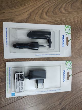Regalo cargadores Nokia para dispositivos con conector de 2 mm. Están nuevos, sin usar, en sus embalajes originales. - Incluye un cargador de coche Nokia Mobile Charger DC-4 con cable espiral. - Incluye un cargador de pared Nokia High Efficiency Charger AC-8E.