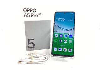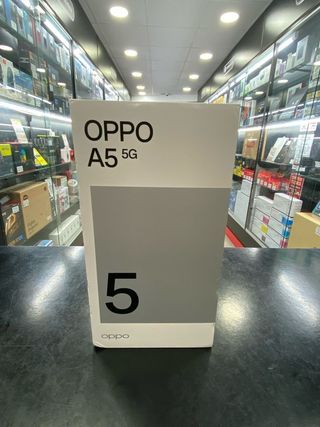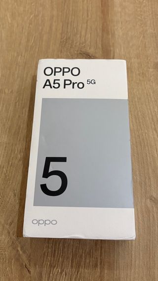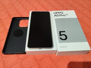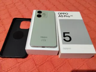 Teléfono móvil Oppo A5 Pro 5G en su caja original, junto con una funda protectora. - Modelo A5 Pro 5G. - Incluye funda negra.