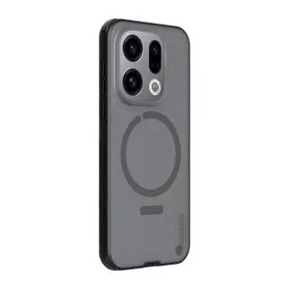 Funda protectora para OPPO Find X9 con un diseño texturizado de la marca Nillkin - Acabado gris oscuro traslucido. - Diseño con anillo magnético integrado. - Logo de la marca visible en la parte inferior.